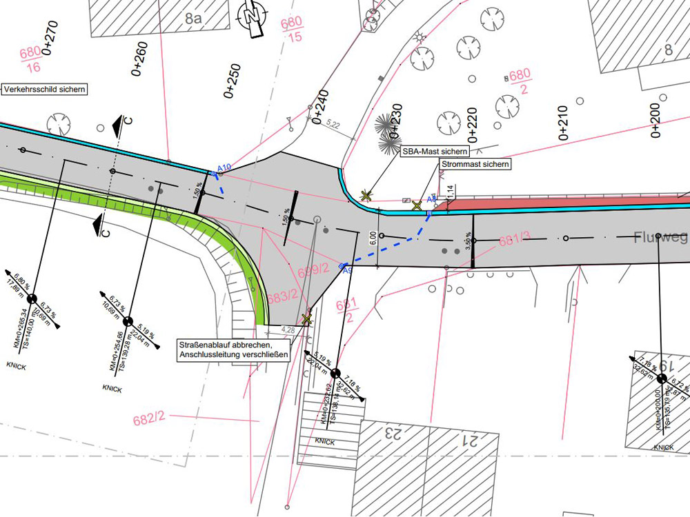 - Ausbau des Entwässerungsnetzes mit neuen Straßenabläufen, Anpassung vorhandene Entwässerungsrinne im Flurweg sowie Neubau Betonsteinrinne in Neubauernsiedlung