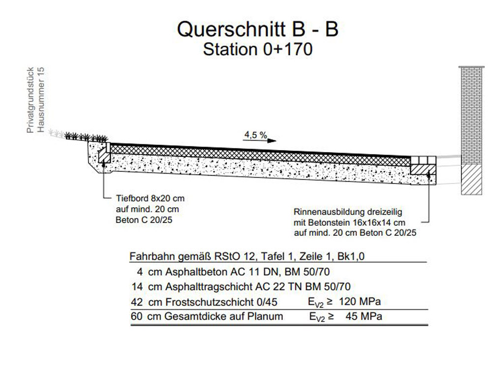 - Anpassung der Querneigung und Fahrbahnbreite trotz limitierter und unterschiedlicher Breiten durch angrenzende Bebauung