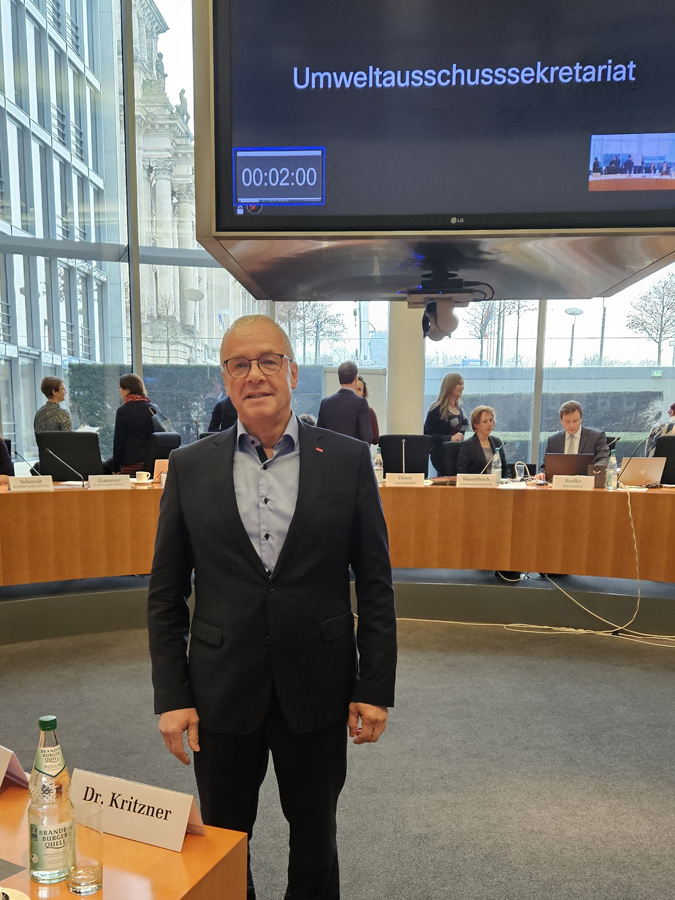 Dr. Kritzner wurde durch die CDU/CSU-Fraktion als Sachverständiger bestellt. In mehreren Vorgesprächen wurde der Sachverhalt mit Lars Rohwer (MdB) erörtert und diskutiert. Zur Vorbereitung der Anhörung wurde ein Statement zur Umsetzbarkeit von Wasserüberleitungen aus Oder, Neiße und Elbe zur Stärkung des Wasserdargebotes der Spreeregion erarbeitet und den Abgeordneten zur Verfügung gestellt.