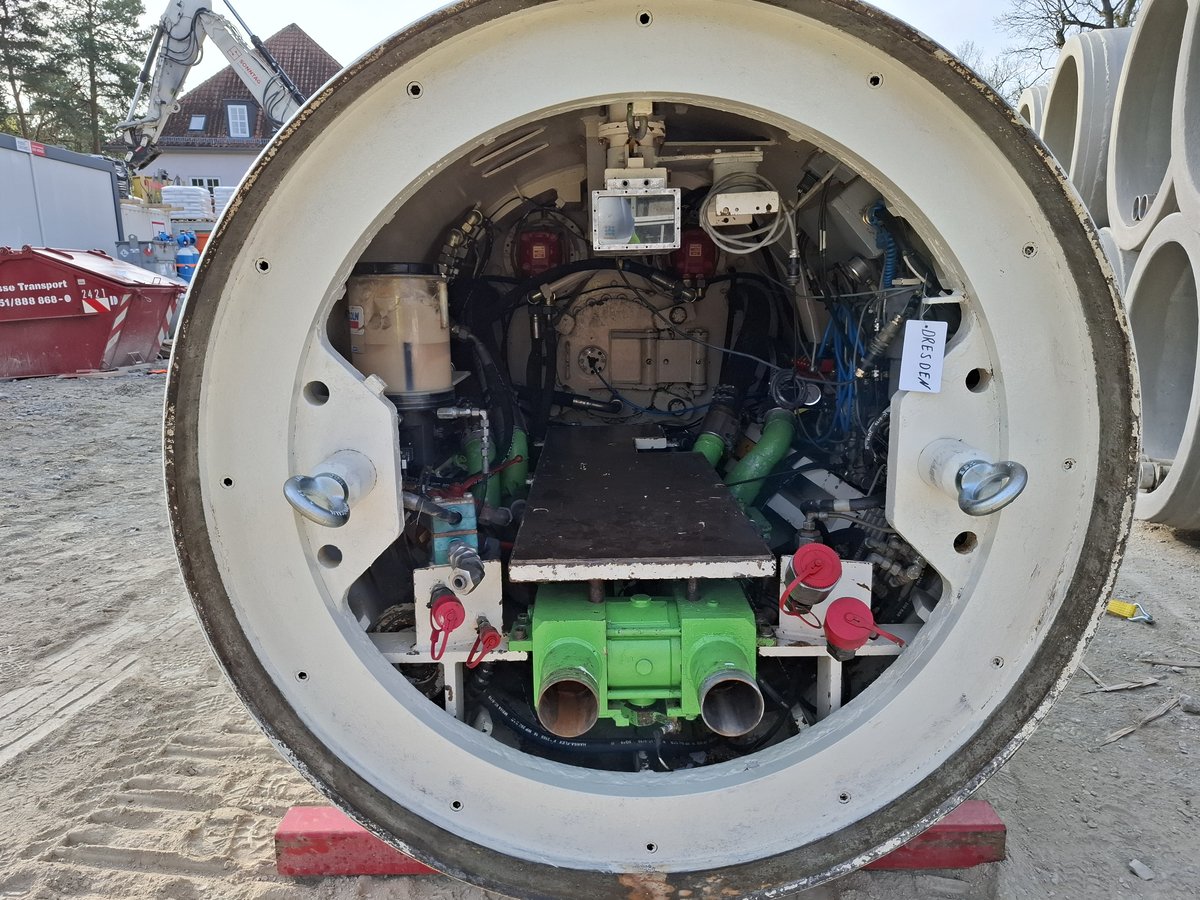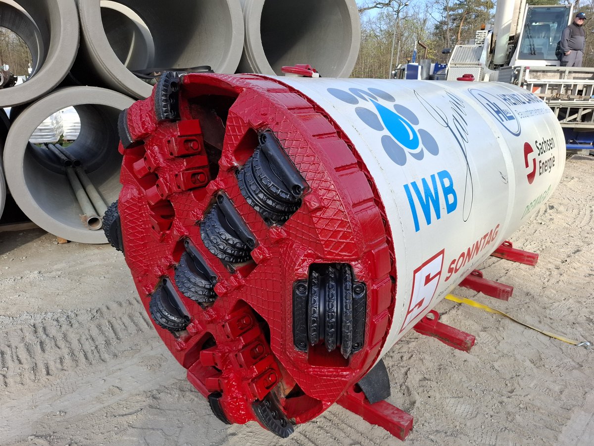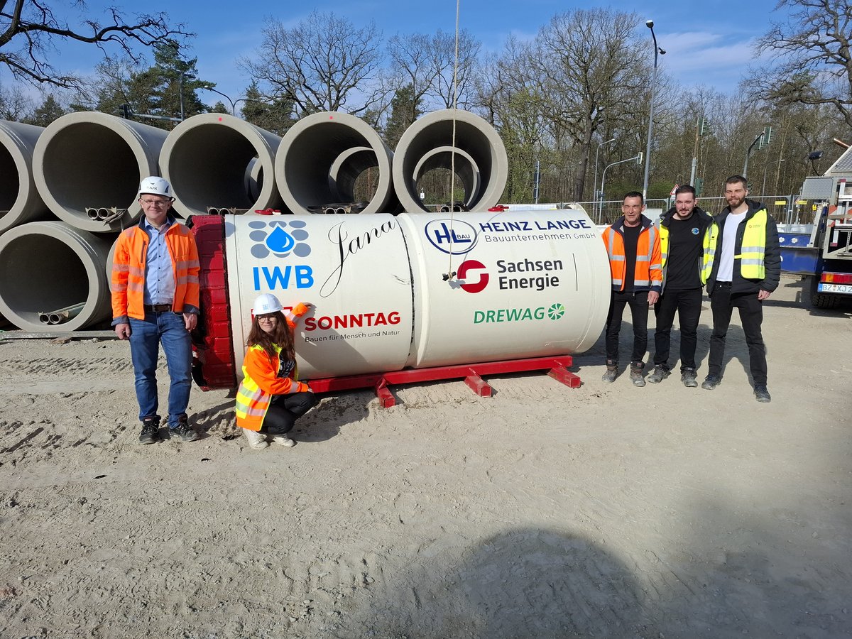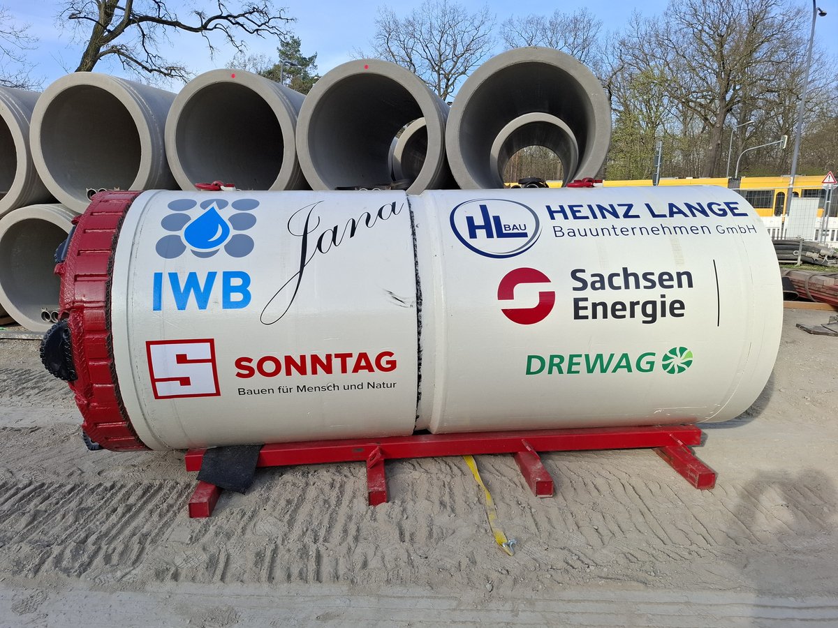Im Rahmen der Erschließung einer Fabrikerweiterung sind im Dresdner Norden vier Straßenquerungen DN 1.200 Stb in geschlossener Bauweise herzustellen. Die Rohre haben einen Außendurchmesser von 1,5 m. Die erste Querung mit einer Länge von knapp 100 m wurde am 03.04.2025 abgeschlossen.