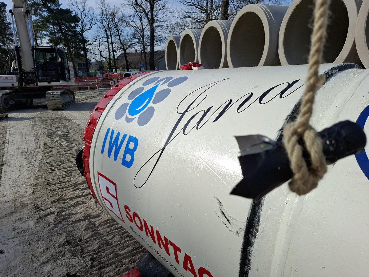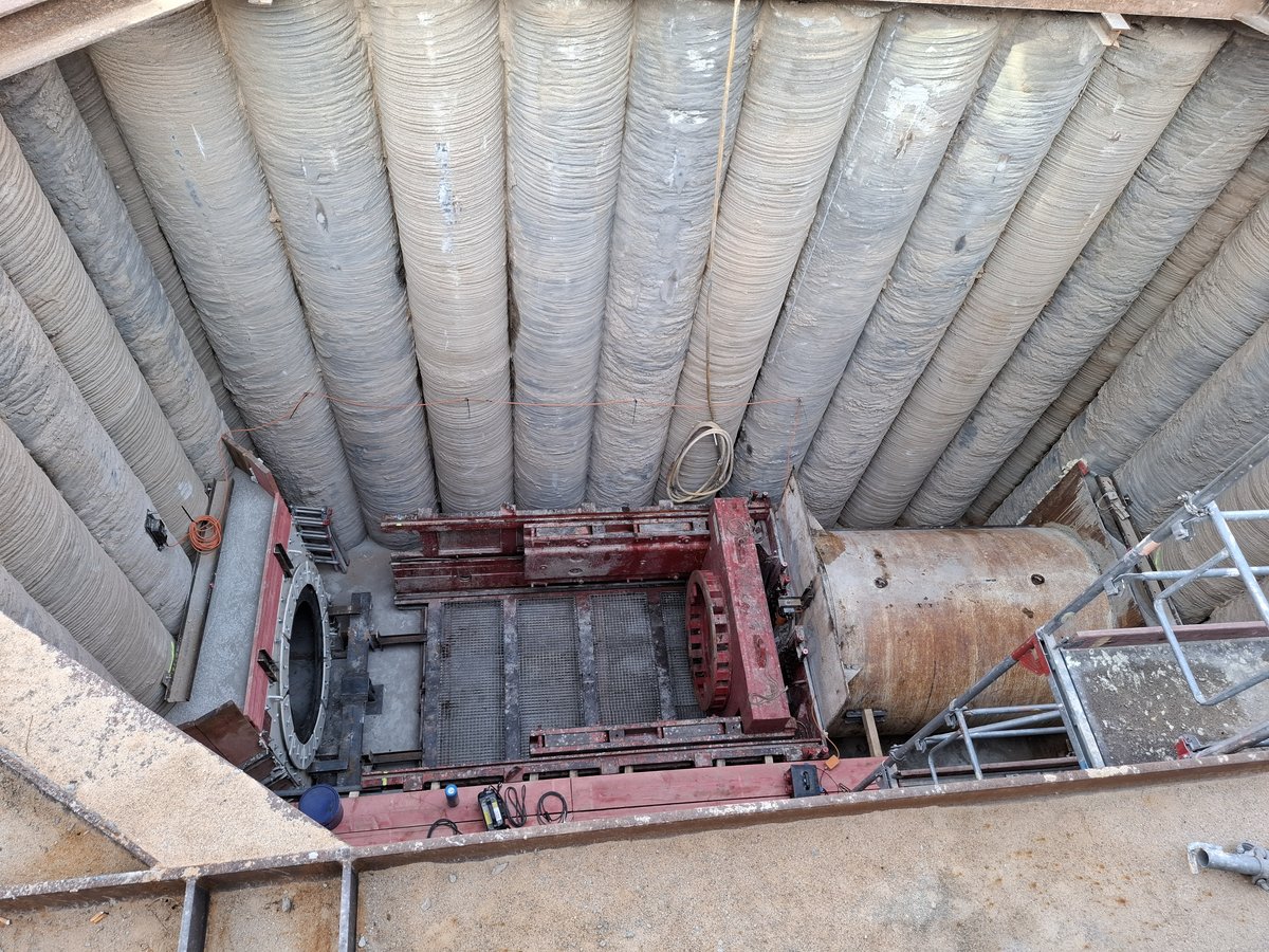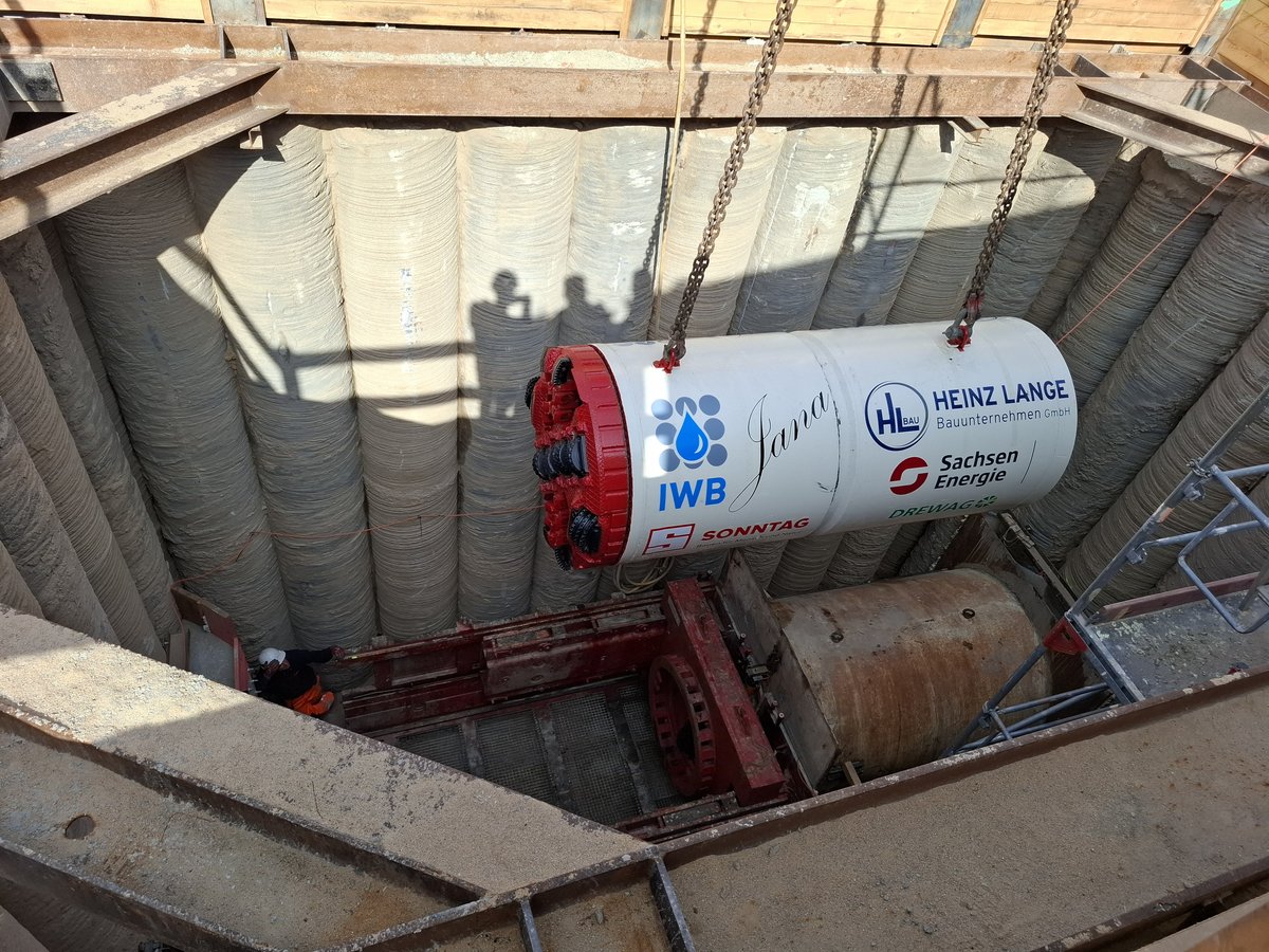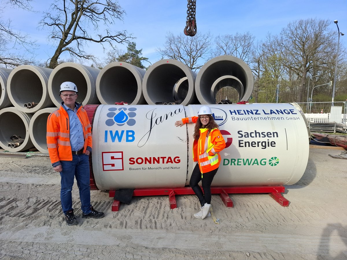 Im Rahmen der Erschließung einer Fabrikerweiterung sind im Dresdner Norden vier Straßenquerungen DN 1.200 Stb in geschlossener Bauweise herzustellen. Die Rohre haben einen Außendurchmesser von 1,5 m. Die erste Querung mit einer Länge von knapp 100 m wurde am 03.04.2025 abgeschlossen.