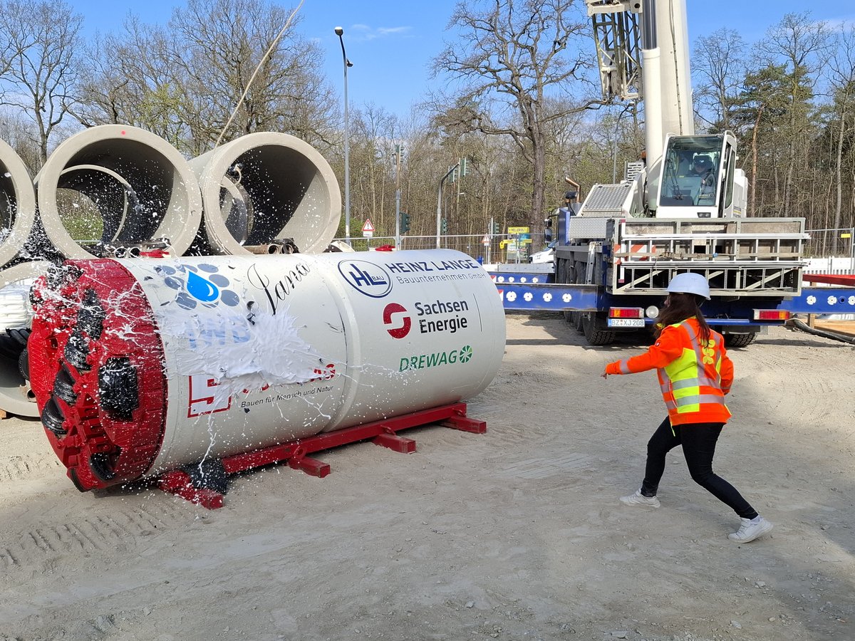 Nach Aufbereitung der Maschine erfolgte am 14.04.2025 die Weihung für die zweite Straßenquerung parallel zur Königsbrücker Straße unter dem Manfred-von-Ardenne-Ring hindurch. In die ebenfalls knapp 100 m lange Bohrung werden Leerrohre für zwei 110 kV-Systeme eingezogen. Die Medienrohre haben eine Überdeckung von bis zu 7 m.