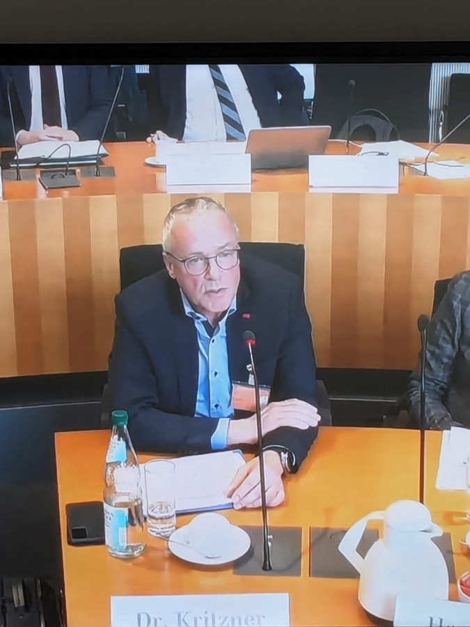 Dr. Kritzner wurde durch die CDU/CSU-Fraktion als Sachverständiger bestellt. In mehreren Vorgesprächen wurde der Sachverhalt mit Lars Rohwer (MdB) erörtert und diskutiert. Zur Vorbereitung der Anhörung wurde ein Statement zur Umsetzbarkeit von Wasserüberleitungen aus Oder, Neiße und Elbe zur Stärkung des Wasserdargebotes der Spreeregion erarbeitet und den Abgeordneten zur Verfügung gestellt.